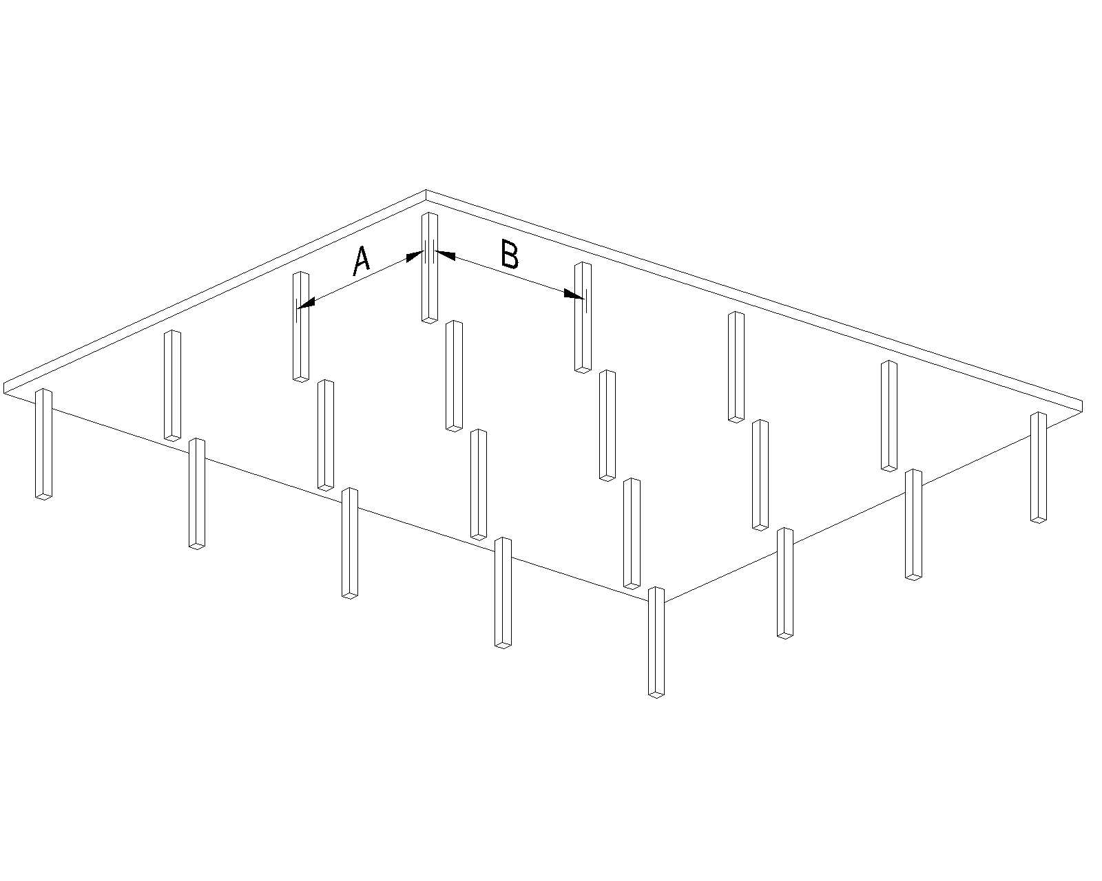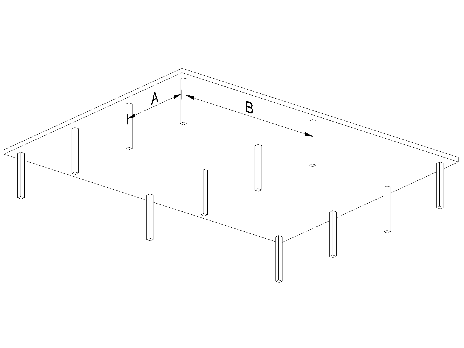Figure 54. Slab support layout: (a) A · B = 7 · 14 m for reinforced concrete and composite systems and A · B = 6 · 12 m for timber systems; (b) A · B = 7 · 7 m for reinforced concrete and composite systems and A · B = 6 · 6 m for timber systems.