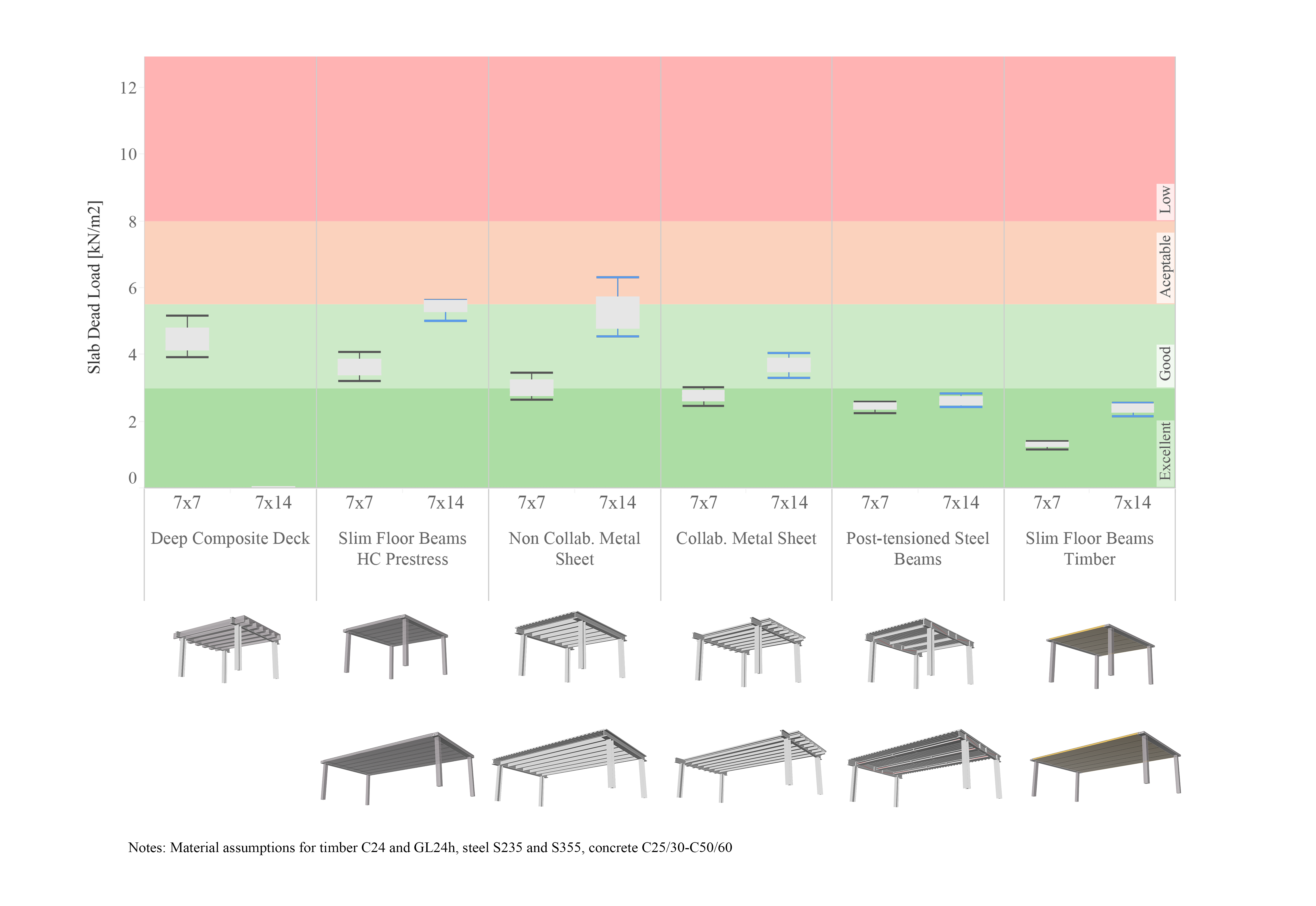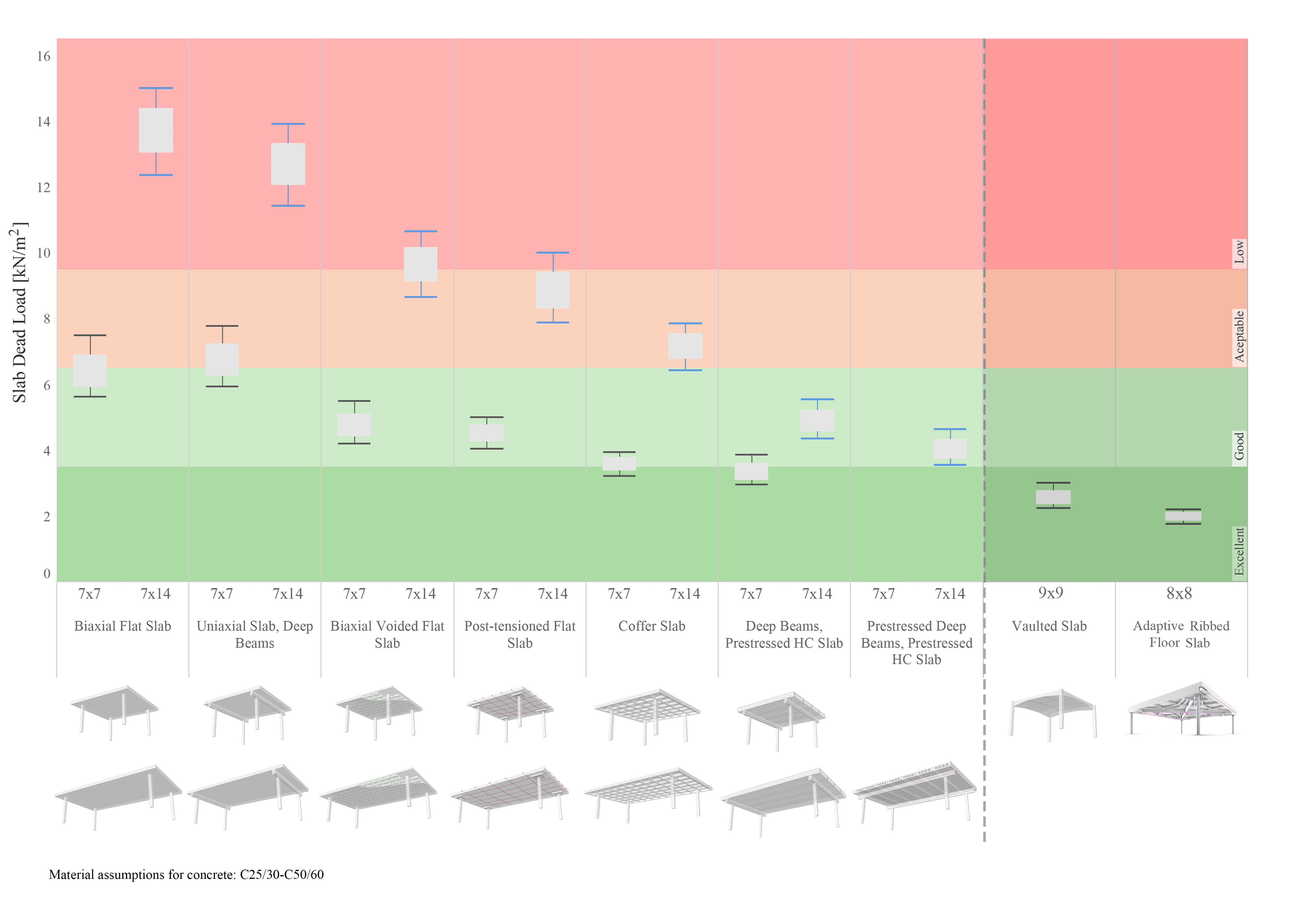 In the box plot map of Figure 55, emerging technologies for concrete slabs are reported on the right side of the dashed line. For vaulted floor systems, values are adapted from a structural design developed by ARUP and Laing O’Rourke on a 9 · 9 m layout (Scott, 2022). The adaptive ribbed slab is an experimental design developed at the University of Stuttgart that uses active tendons integrated in the ribs to counteract the effect of superimposed dead and live load (Reksowardojo et al., 2024). Further information about these systems is given in Table A. 1.