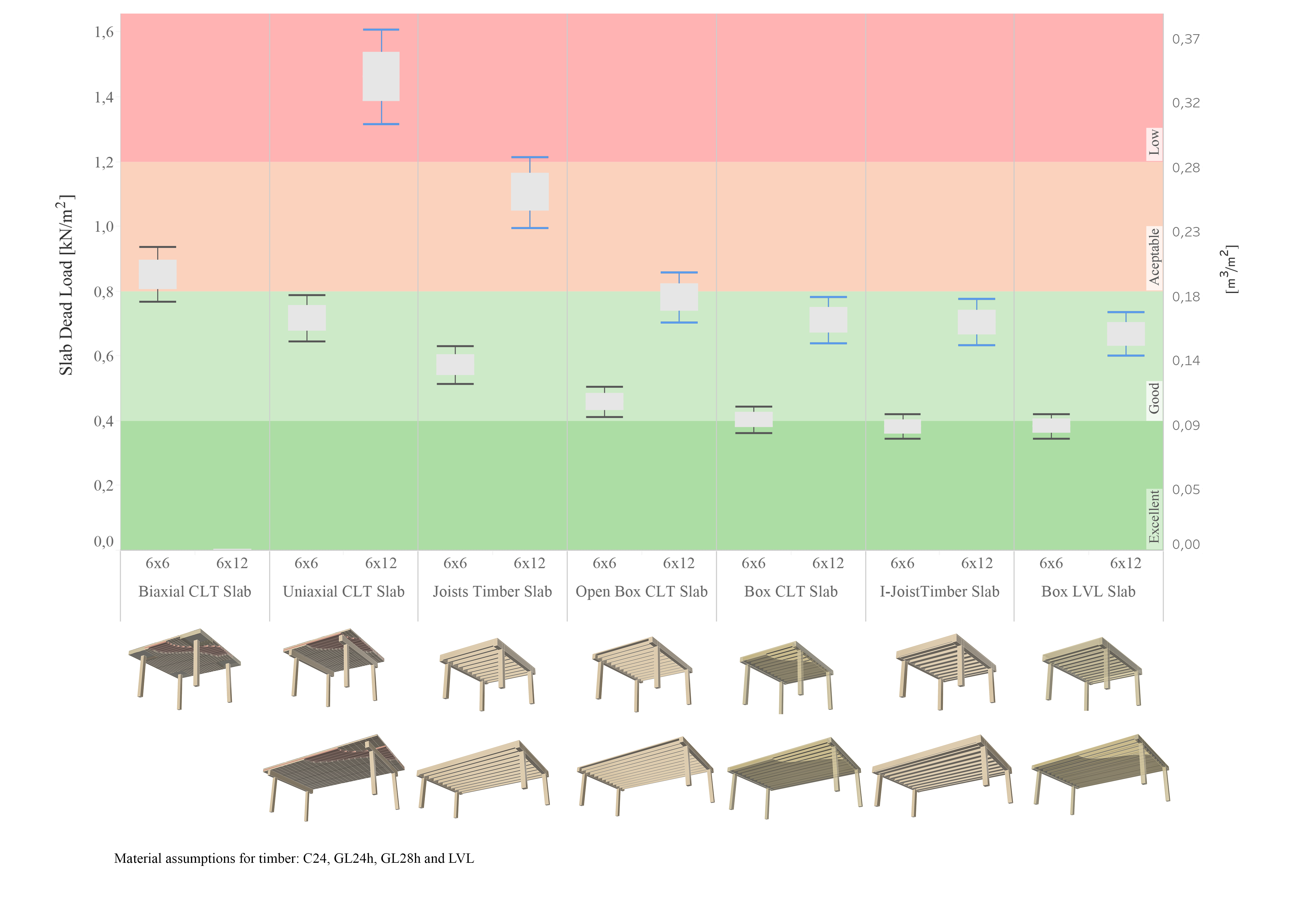 For timber floor slabs, a metric of material volume per floor area (in m3/m2) is added as a secondary vertical axis, since it is commonly used in practice. However, B.2.3 score for self-assessment is based on the self-weight g. The conversion to material volume per floor area is approximate, considering a density of timber equal to 415 kg/m3 that is the average value of C24 timber (350 kg/m3) and laminated veneer lumber (LVL) (480 kg/m3).